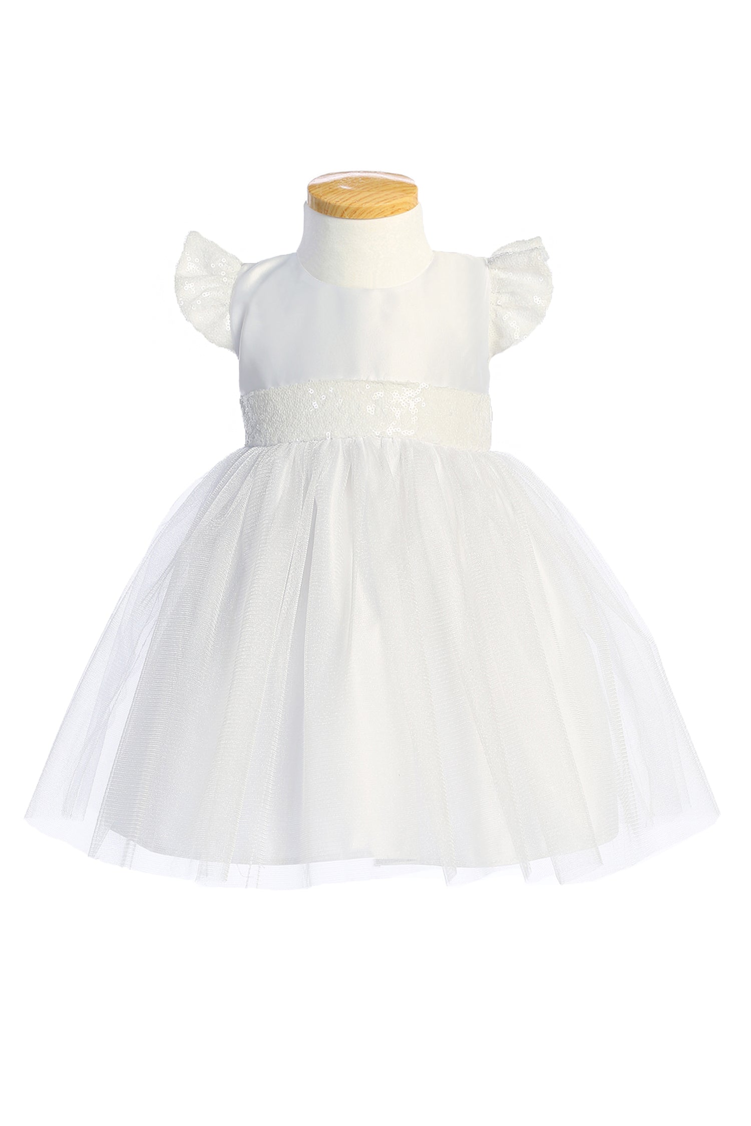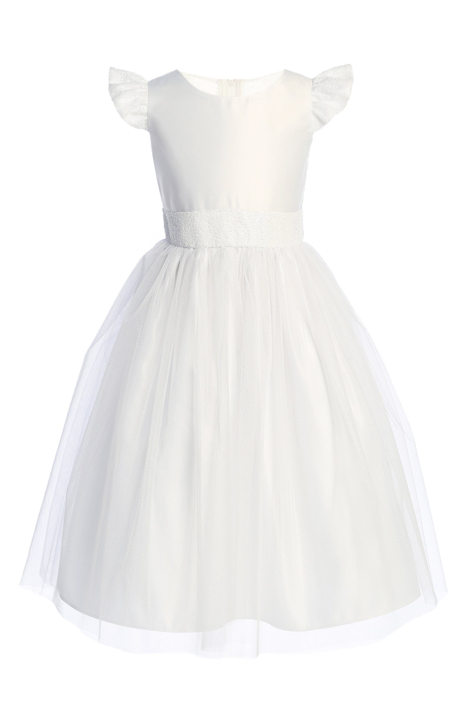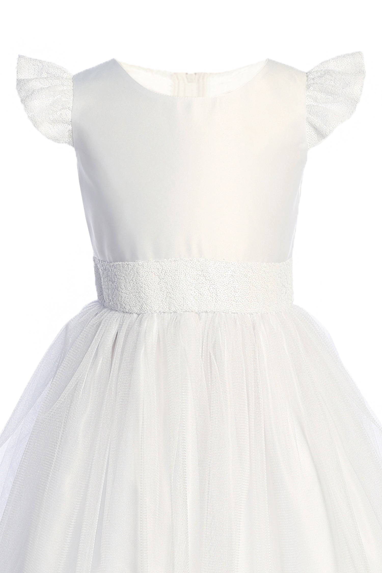 Satin with Crystal Tulle skirt, Sequin detail on Flutter Sleeve and on Waist band