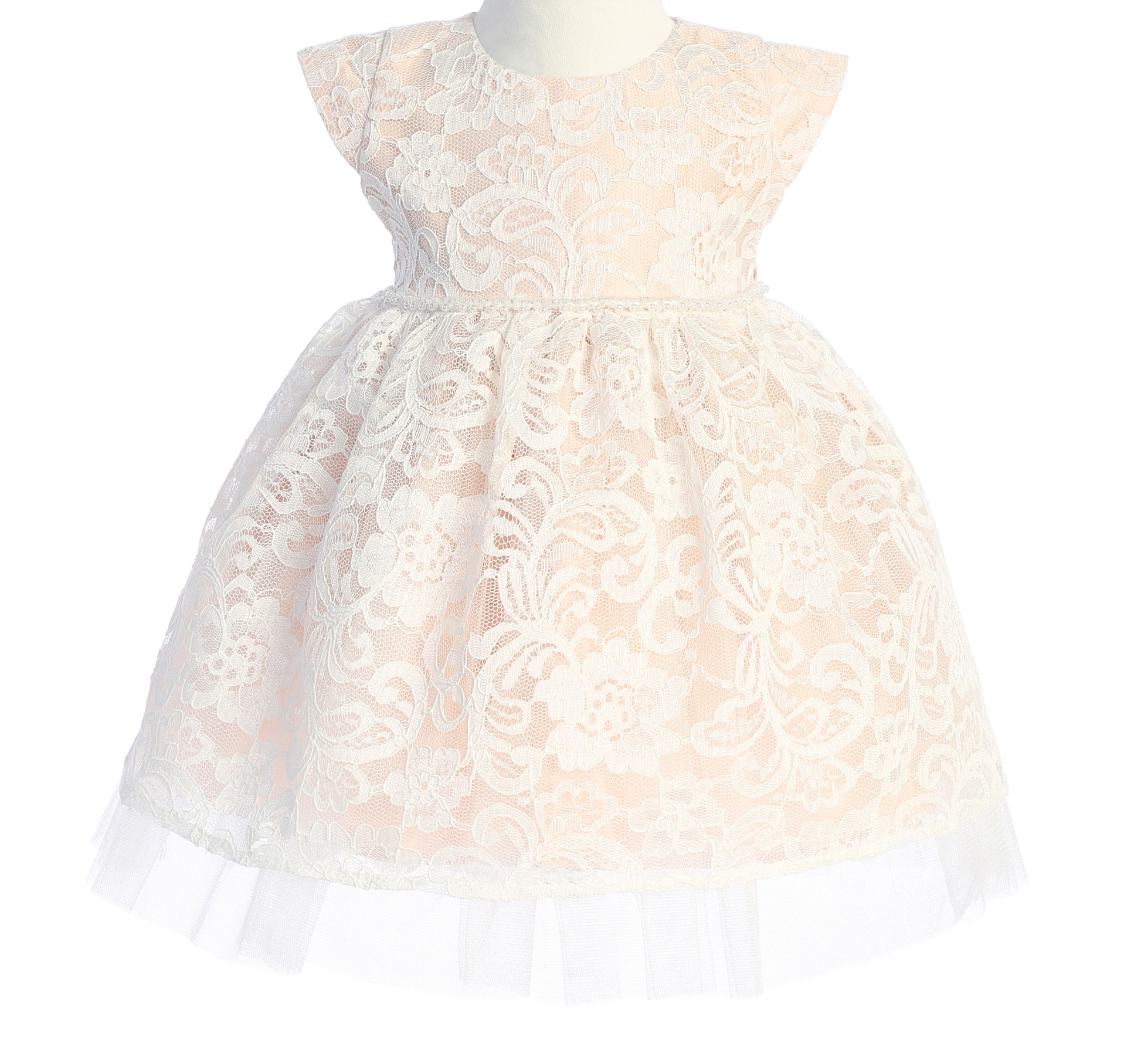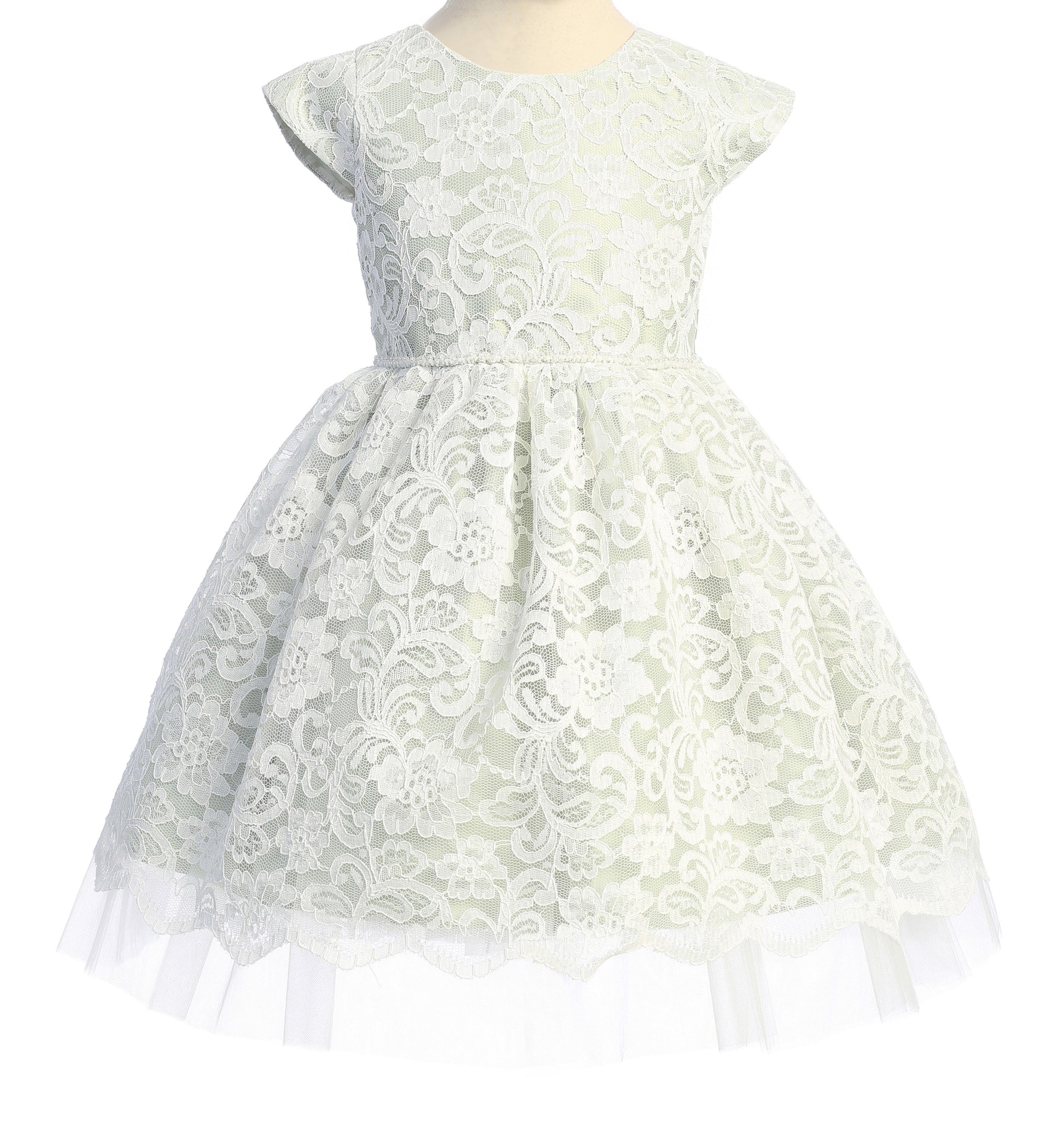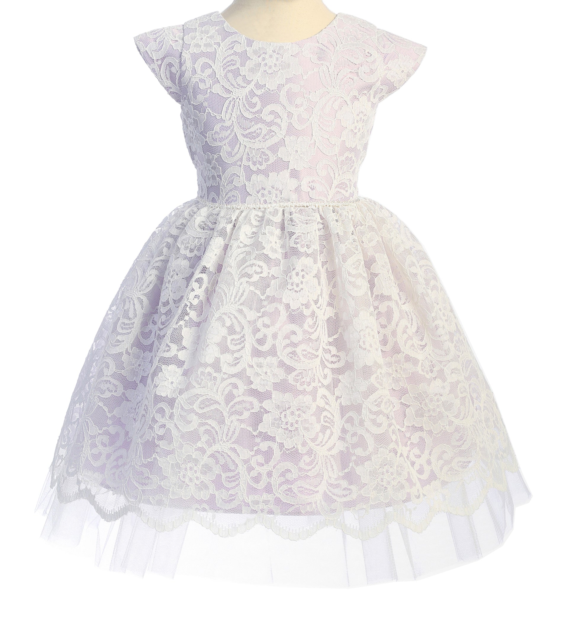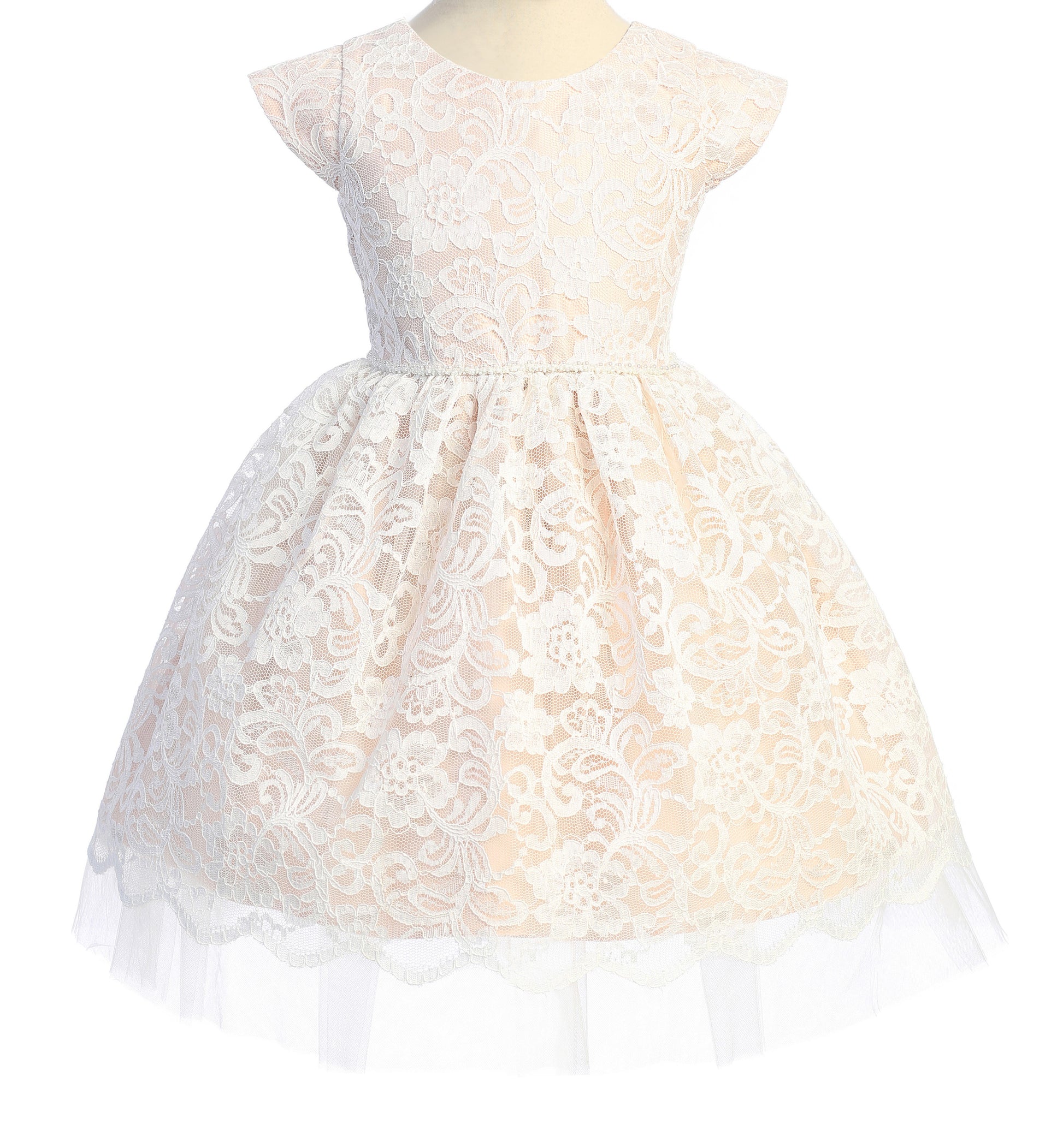 Pretty Floral Embroidered Lace Dress with Satin and Peek a Boo Tulle, Petite Pearl Trim on Waist