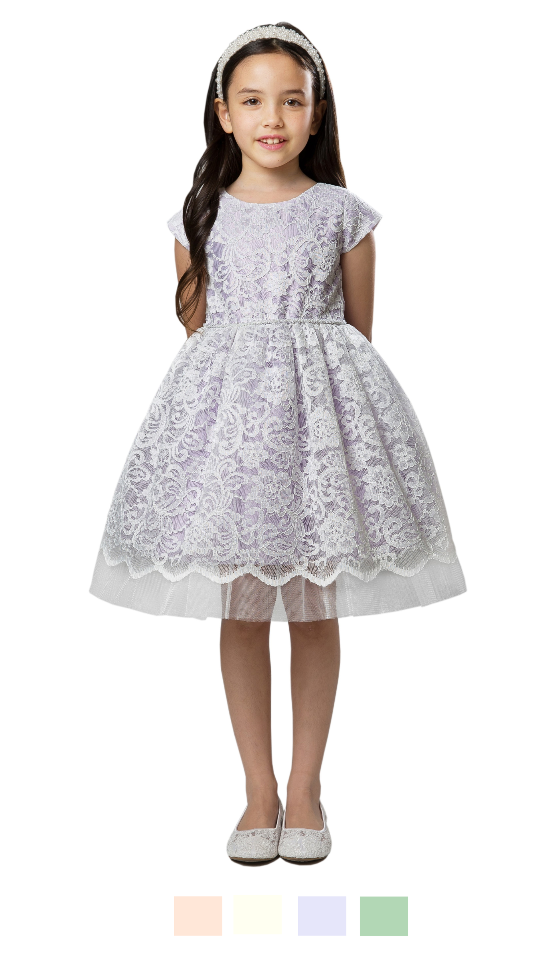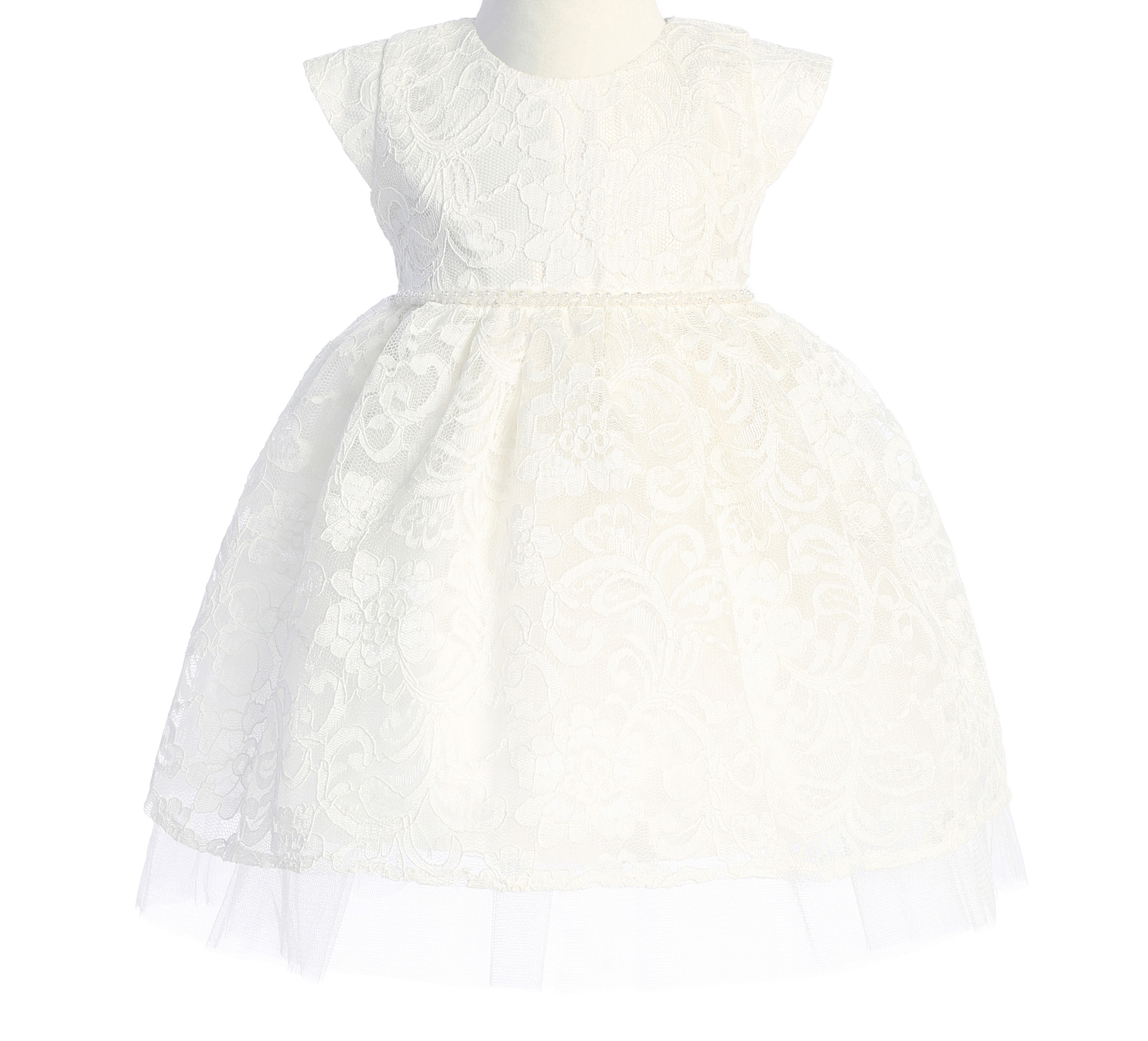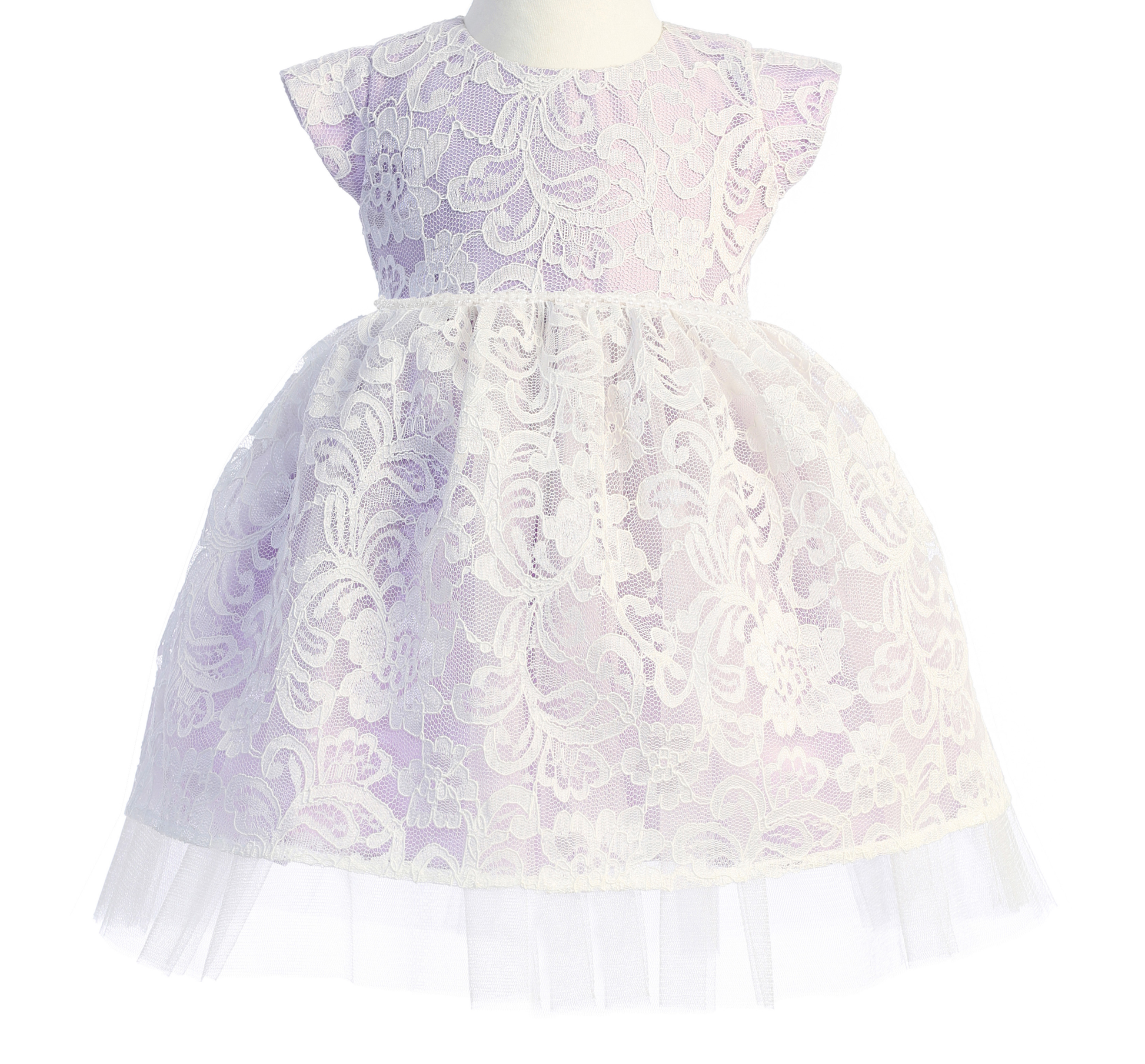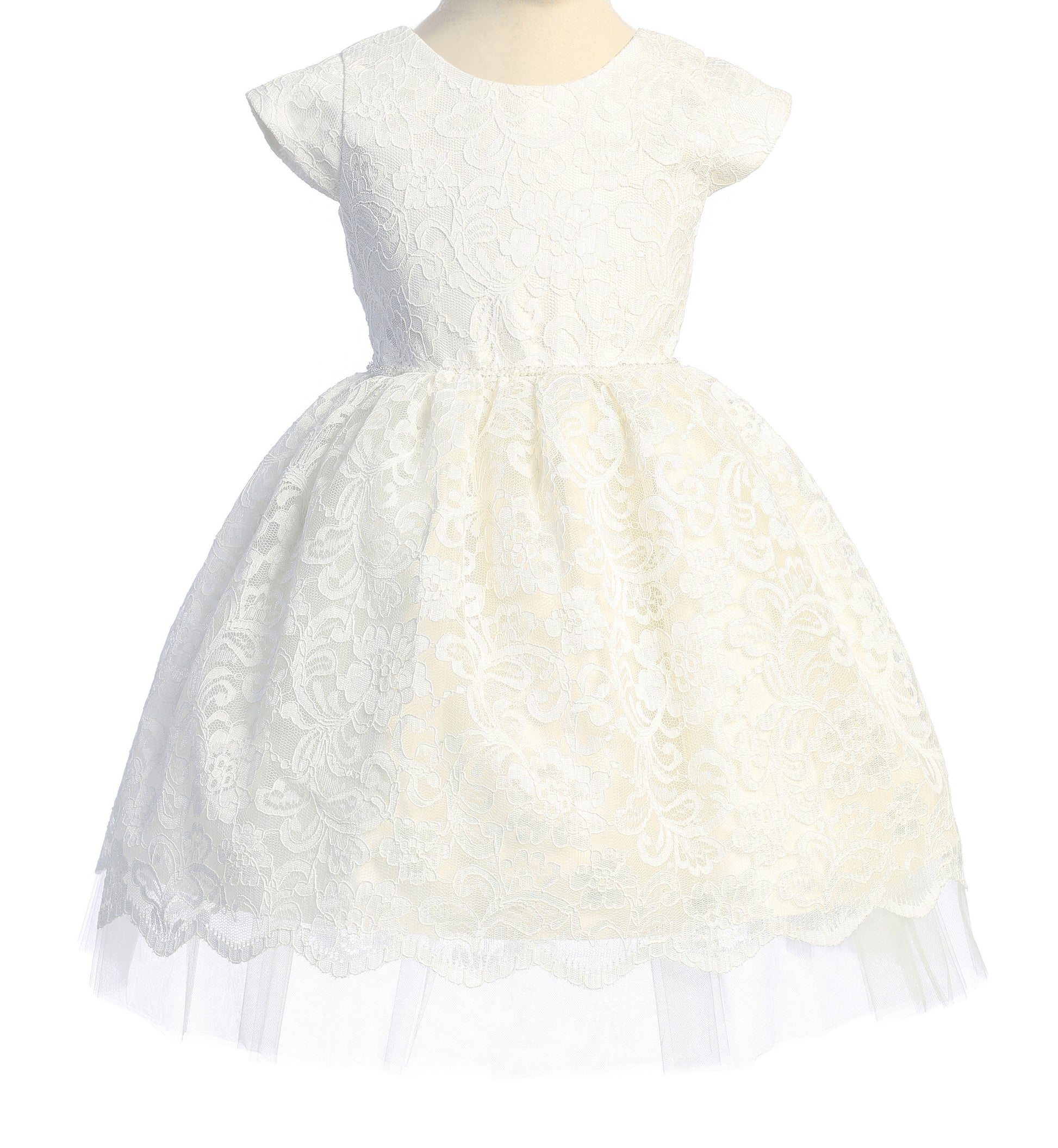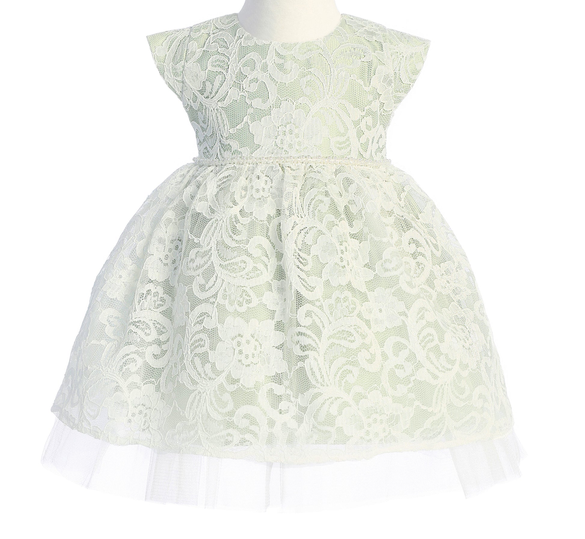 Pretty Floral Embroidered Lace Dress with Satin and Peek a Boo Tulle, Petite Pearl Trim on Waist