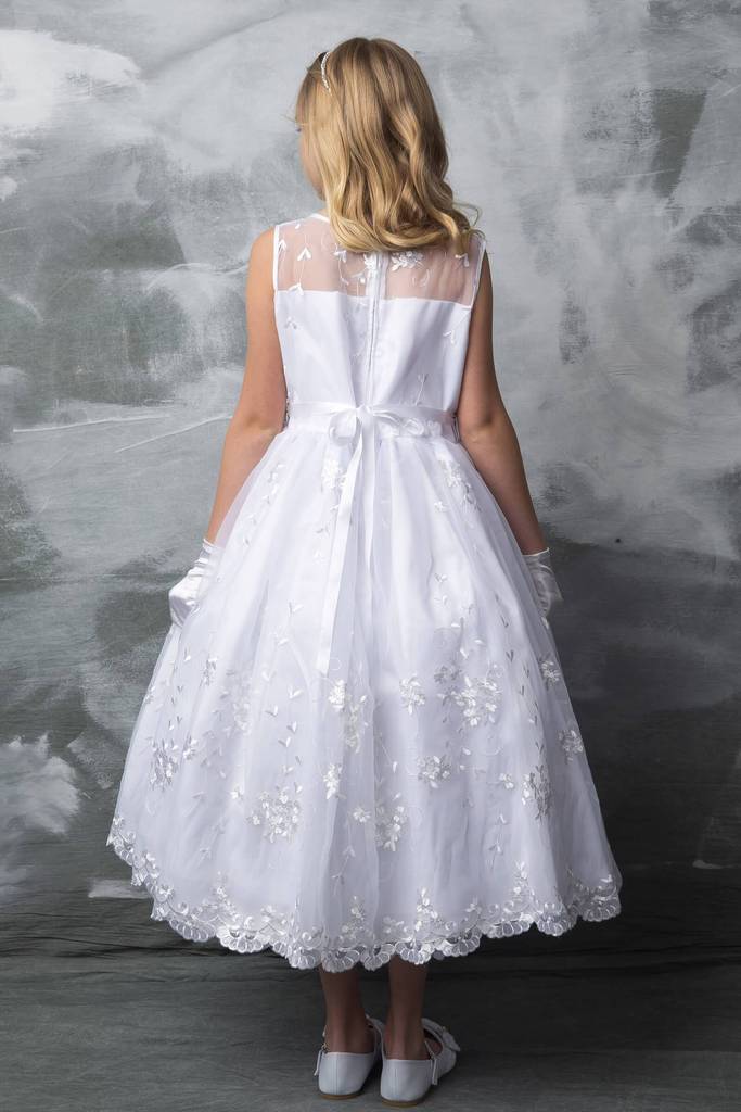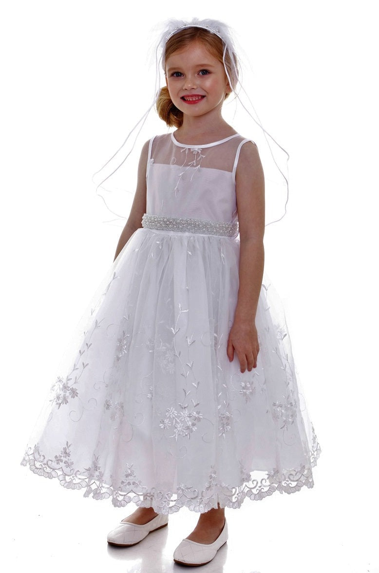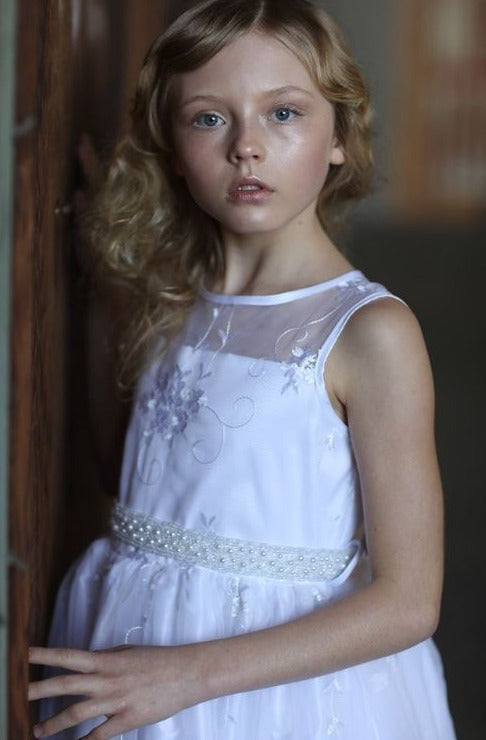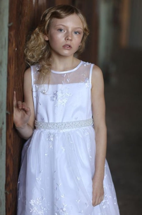 Gorgeous Lace Floral Dress with Tulle Illusion shoulders and Detachable Pearl Sash