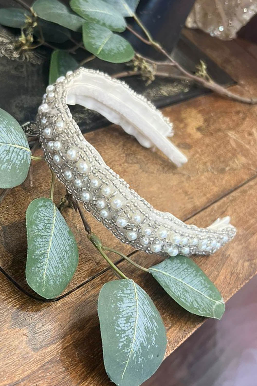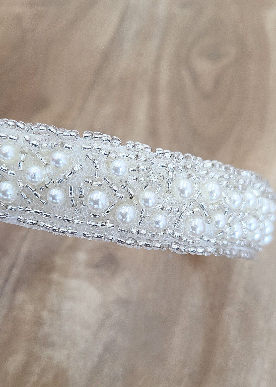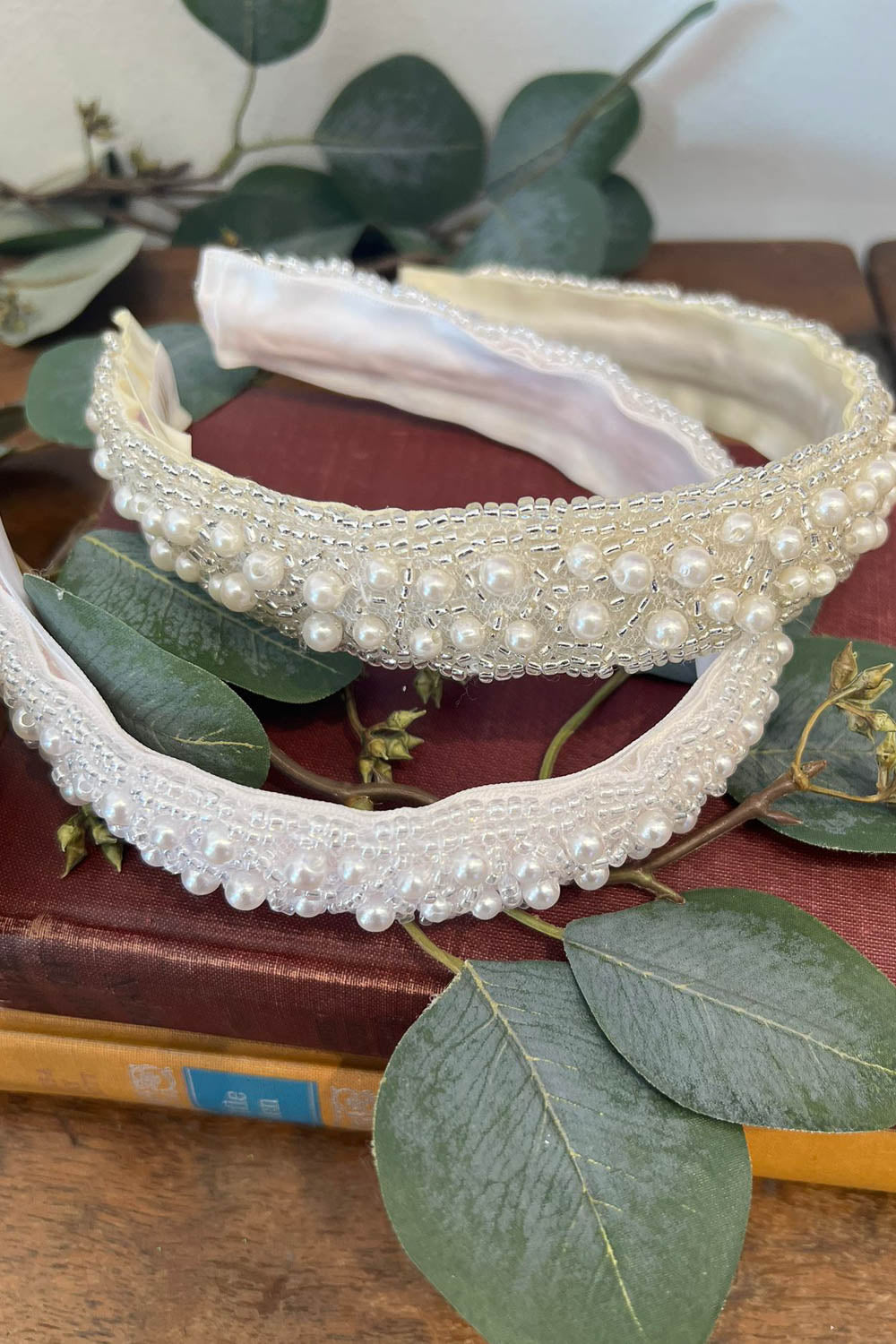 Gorgeous Pearl Headband which beautifully matches our Elsie dress and Pearl sash