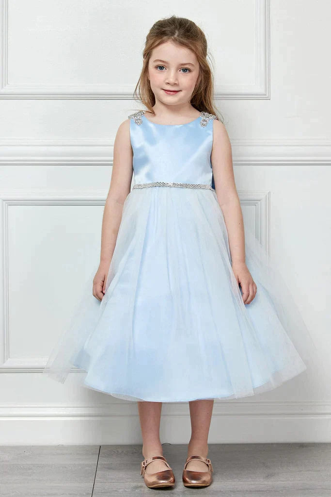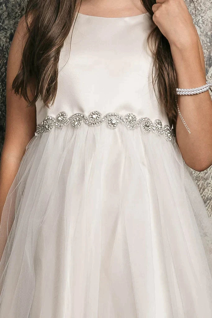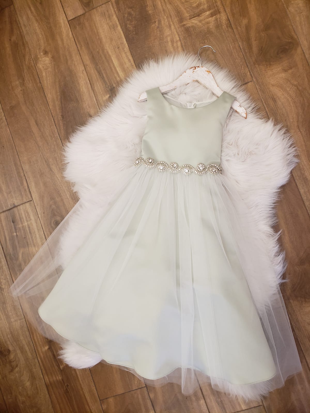 Comes with tie back Satin Sash and Pin on Flower bouquet - At and additional cost you can change your sash to *Round Rhinestone Sash*